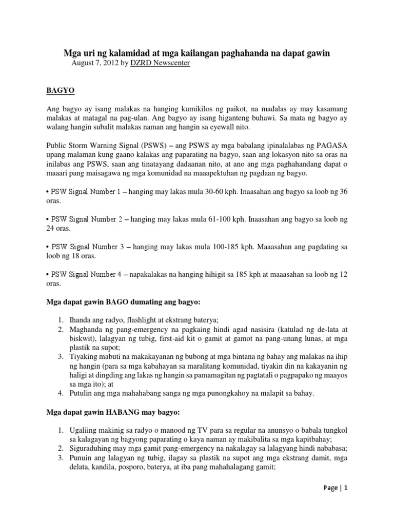 Alamin dito ang mga dapat gawin bago habang at pagkatapos ng isang bagyo o baha. Ngunit mga ka-Alerto alalahanin natin na sa oras ng sunog ito ay dapat ibigay lang ng mga taong may sapat na kaalaman tungkol dito. Ang mga sumusunod ay mga paalala at payong dapat isagawa kaugnay ng paghahanda para sa kalamidad sakuna at panganib.