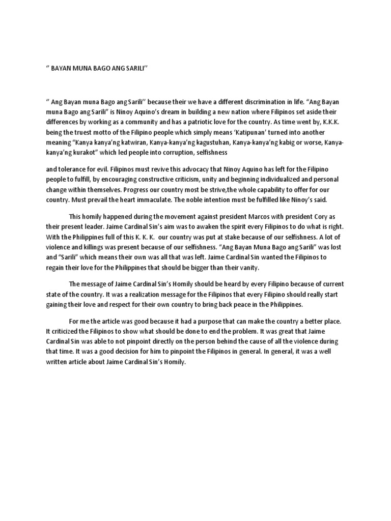 Reaction paper about bayan muna bago ang sarili in english. Alam naman natin na likas sa mga Pilipino ay makapamilya. Ramos Grade 12- ABM Reaction Paper to Ang Bayan Muna Bago ang Sarili Ang Bayan Muna Bago ang Sarili Excerpts from the Homily of Jaime Cardinal Sin at the mass celebrating the 5th death anniversary of Ninoy Aquino Ang Bayan muna Bago ang Sarili is Ninoy Aquinos dream in building a new nation where Filipinos set aside their differences by.